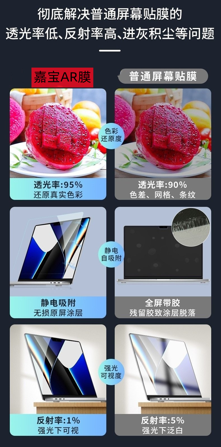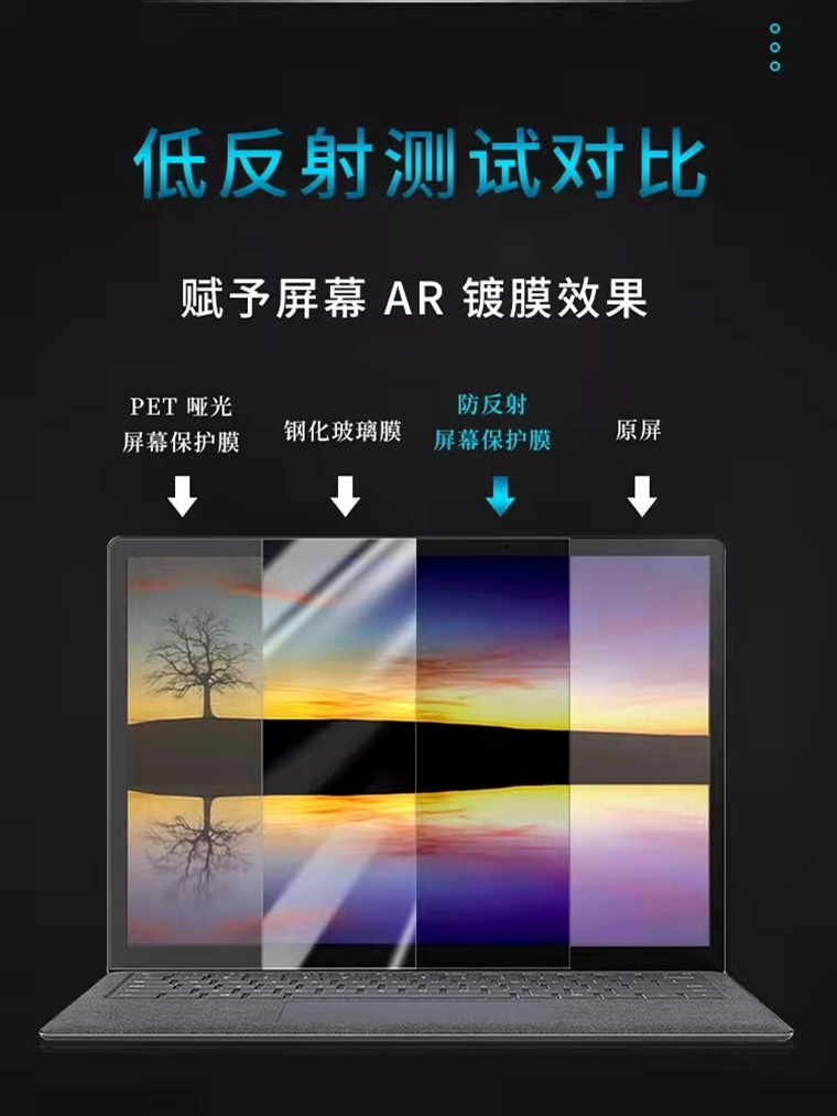 產(chǎn)品特點:筆記本電腦膜為日本進口材料,表面反射率1%以下,高透光率95%以上,防刮2H,水低角115度,性好,防爆性好;使用層采用40um靜電吸附層解決貼合容易產(chǎn)生氣泡與灰塵問題;